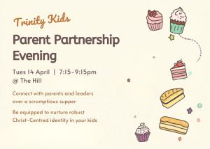 672 North East Rd Holden Hill The Hill Directions Parent Partnership Evening Date Tuesday 14 April, 2026 Time 7:15 pm – 9:15 pm Connect with parents and leaders over a tasty supper! Come and be equipped to nurture a robust Christ-centred identity in your kids…We will also be doing an overview of or term 2 Kids Church ‘Who am I’ series. RSVP by 12th April here Share this page: