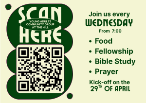Join our Young Adults Community Group at the Hill every Wednesday from 7:00pm. It’s a great space to connect, with food, fellowship, Bible study, and prayer each week. Whether you’re new or have been around for a while, you’re welcome to come along. We kick off on the 29th of April, scan the QR code or click the invitation for more details.